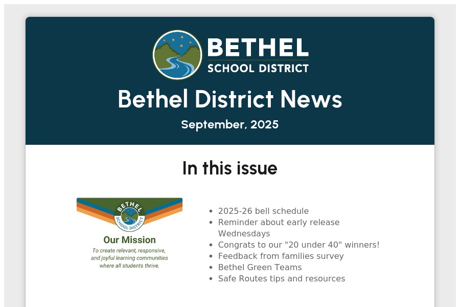 Bethel District News September, 2025 In this issue 2025-26 bell schedule Reminder about early release Wednesdays Congrats to our "20 under 40" win. . .
